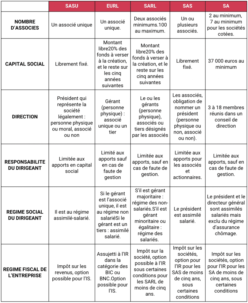 4. Tableau comparatif des statuts juridiques